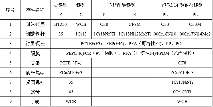 G41F46-10/16C衬氟隔膜阀主要零件的材料说明: