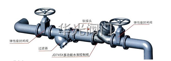 多功能水泵控制阀是安装在高层建筑给水系统以及其他给水系统的水泵出口处、防止介质倒流、水锤及水击现象的智能型阀门。该阀兼具电动阀、逆止阀和水锤消除器三种功能,可有效的提高供水系统的安全可靠性。并将缓开、速闭、缓闭消除水锤的技术原理一体化,防止开泵水锤和停泵水锤的产生。只需操作水泵电机启闭按扭,阀门即可按照水泵操作规程自动实现启闭,流量大、压力损失小。